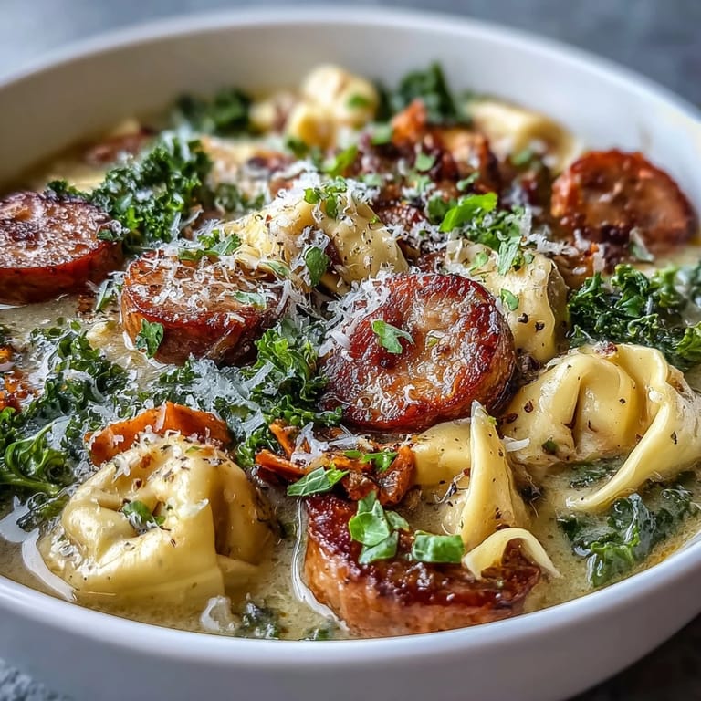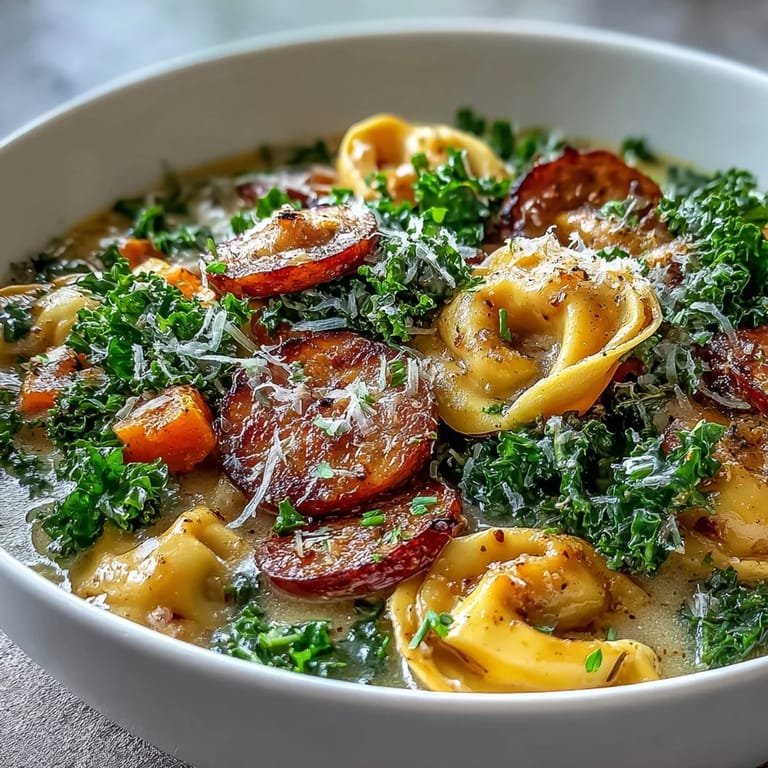 Pin It This Pumpkin Tortellini Soup with Chicken Sausage and Kale is the ultimate comfort food for a chilly day. It is a cozy, creamy autumn soup featuring tender pumpkin, savory chicken sausage, cheesy tortellini, and vibrant kale for a hearty, flavorful meal that provides 470 calories and 24 g of protein per serving.